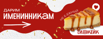 Именинникам при заказе от минимально суммы на доставку в день рождения и 3 дня после - топовый десерт Чизкейк в ПОДАРОК! Предупредите оператора о том, что у вас день рождения и покажите паспорт курьеру для подтверждения